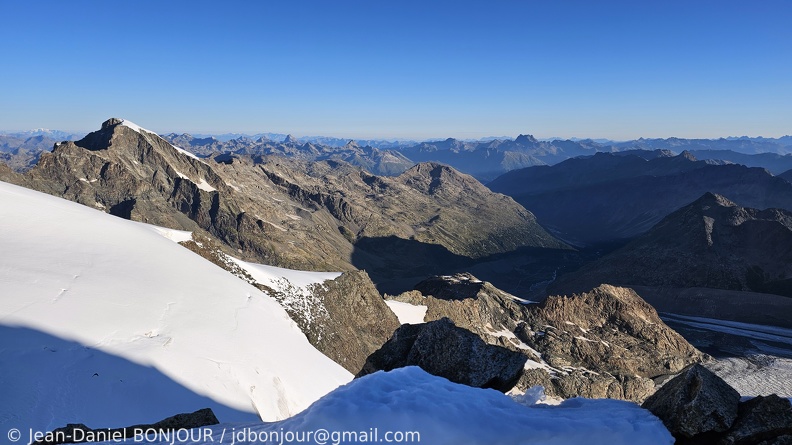 Depuis Piz Palü central, vue vers Piz Zupo, Bellavista, Piz Roseg, Piz Scerscen et Piz Bernina